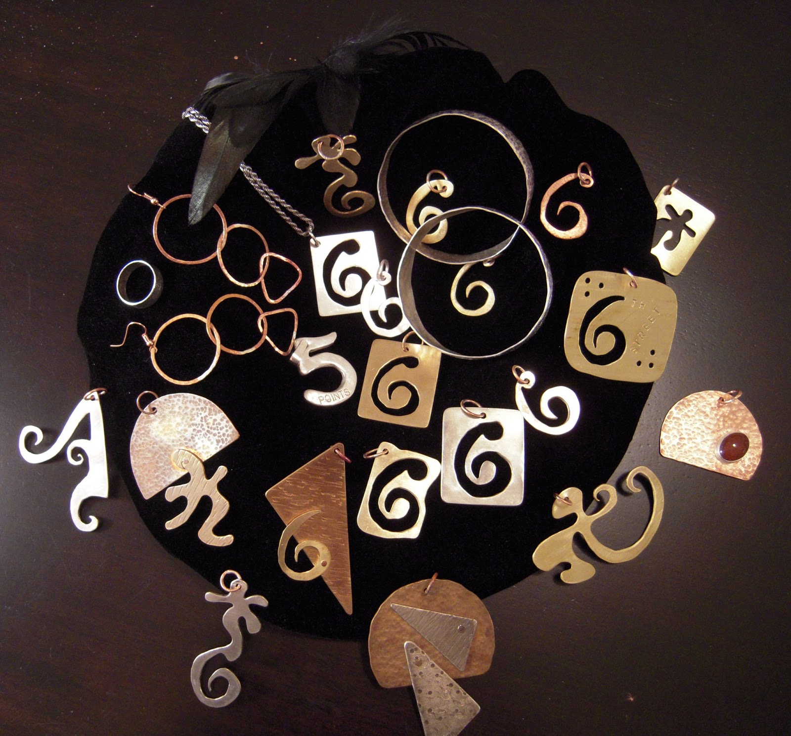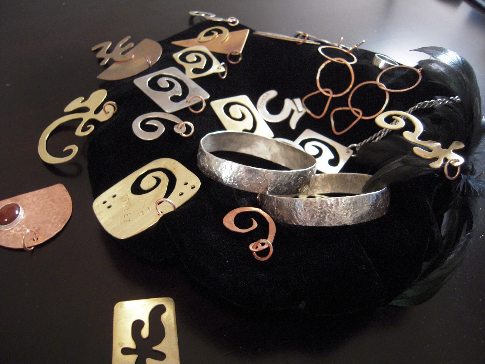 I love beating on metal! Metal-smithing to see what interesting shapes I can hammer out and colors I can create with fire-scale is endlessly fascinating to me. This piece is Nickle Silver and Copper.