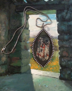 This is such a fun piece! Set in pewter and resin, it's a photographic detail from one of my husband's life-size Portable Parking Space paintings -- a squashed Budweiser can. Shown photographed on one of his paintings created in Cornwall, England. This pendant is definitely a conversation starter!